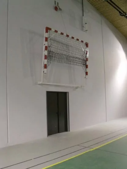 But de hand relevable à fixer au mur, peint aux poudres polyester (pas d’adhésif – spécificité Nouansport) – Relevage par enrouleur électrique situé sur le mur au-dessus du but – Dégagement de l’aire de jeu sur une hauteur minimum de 2,20 m permettant d’autres activités sportives sans avoir à déplacer les buts