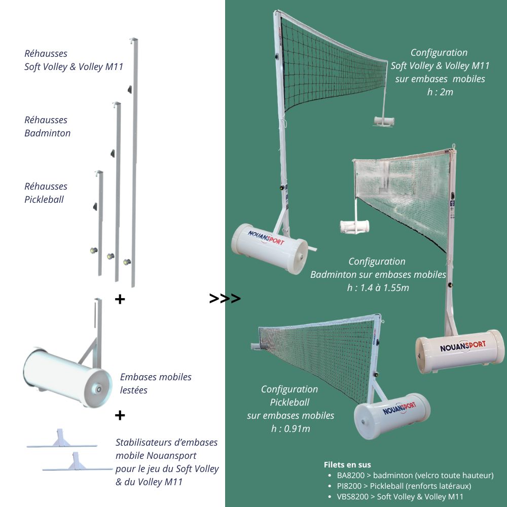 NS+ : Réhausses et filets interchangeables en moins de 5 minutes pour alterner la pratique du soft volley, Volley M11, pickleball et badminton