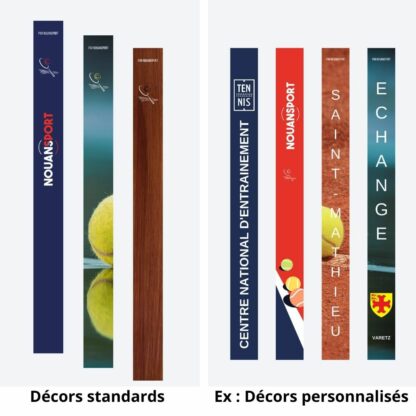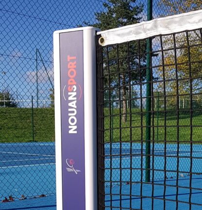 Livré avec le filet spécifique, la paire de poteaux de jeu simple en aluminium et les décors standards Nouansport ou les décors spécifiques (Fichier d’impression fourni par vos soins et/ou création graphique spécifique gérée par Nouansport).