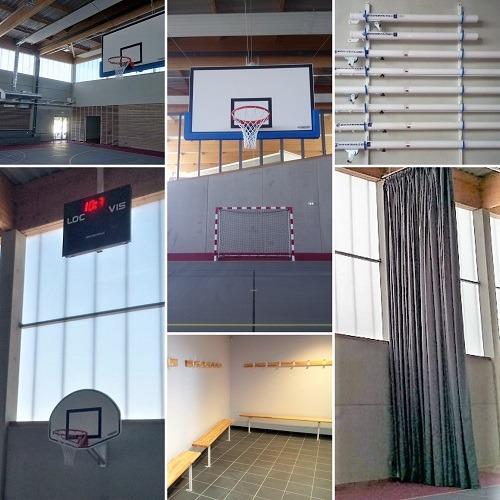 | Descriptif des installations : | Basket charpente relevage électrique, Basket entrainement, séparation de salle, poteaux de Volley, Badminton et Tennis, panneau d’affichage, bancs vestiaires. |