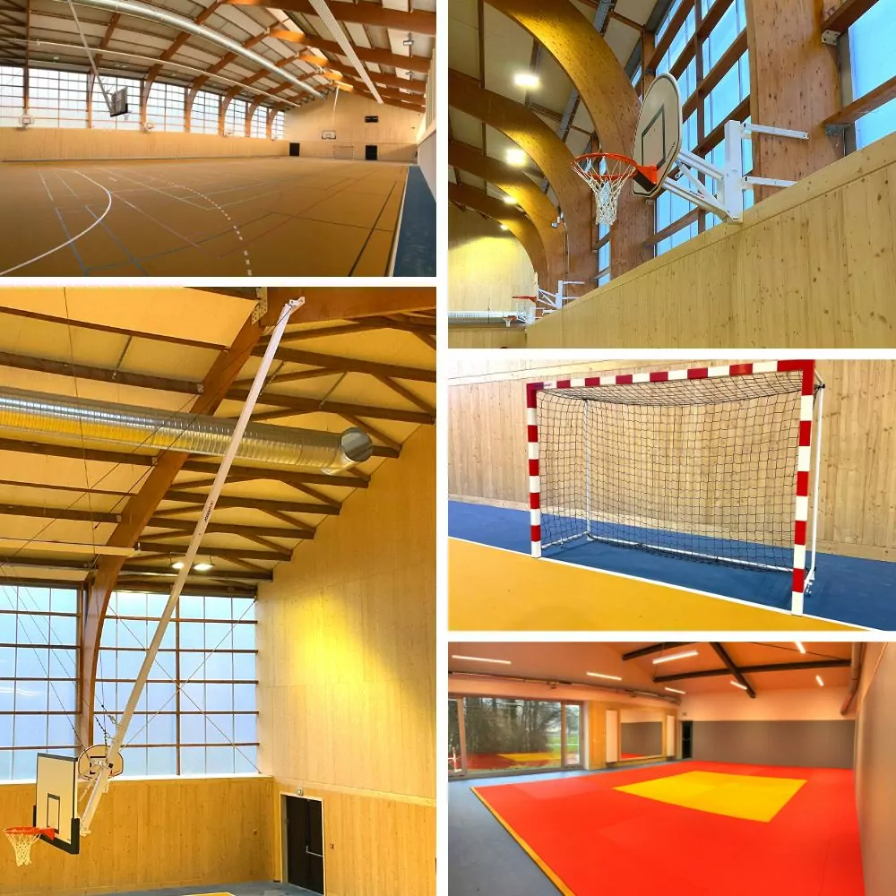 | Descriptif des installations : | Salle de sports : buts de basket relevables en charpente – buts de basket muraux – buts de hand mobiles avec dispositifs d’ancrage Dojo : Protections murales – Tatamis maintenus par un cadre en bois |